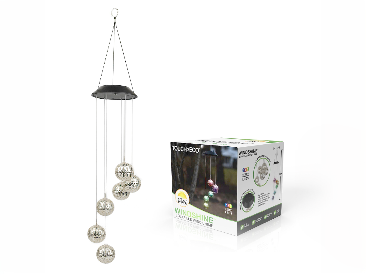 Add a delightful display of light to your patio, lawn, or garden with the WINDSHINE, our solar-powered LED wind chime. Beautiful decoration by day and a glowing cascade of lights at night. Featuring 6 multi-color changing LEDs, each shining from a delicate decorative ornament. Combining a sturdy, shatterproof design with a classic and functional charm. This outdoor hanging illuminated mobile is perfect for any yard or home and makes a great gift for any garden lover.